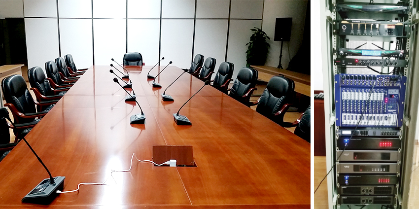 該項(xiàng)目是由我公司負(fù)責(zé)前期設(shè)計(jì)以及設(shè)備提供和安裝調(diào)試。會(huì)議室面積10×12米,整體設(shè)計(jì)包含以下系統(tǒng):會(huì)議擴(kuò)聲系統(tǒng),多媒體顯示系統(tǒng),無(wú)線手拉手會(huì)議系統(tǒng)及中央控制系統(tǒng)。